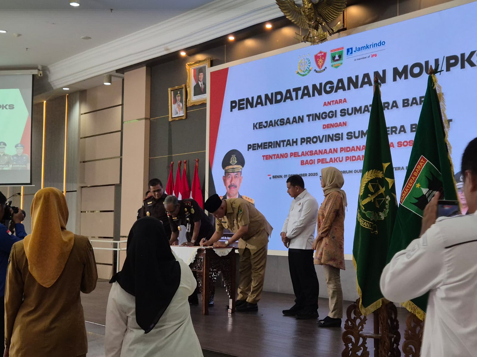 Pada hari Senin, 1 Desember 2025, pukul 10.00 WIB telah dilaksanakan Penandatangan Nota Kesepahaman (MoU) antara Kejaksaan Tinggi Sumatera Barat dan Pemerintah Provinsi Sumatera Barat tentang Pelaksanaan Pidana Kerja Social sebagai alternatif pemidanaan bagi pelaku tindak pidana. Kesepahaman ini disusun sebagai Langkah strategis dalam mempersipakan implementasi ketentuan baru yang diatur dalam Undang-Undang Nomor 1 Tahun 2023 tentang Kitab Undang-Undang Hukum Pidana (KUHP), yang efektif berlaku pada 2 Januari 2026. Acara dihadiri oleh para pejabat stuktural, perwakilan OPD dan unsur penegak hukum yang memiliki keterkaitan langsung dalam penyelenggaraan kebijakan tersebut.